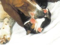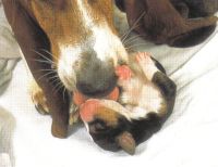 Amint az összes kölyök a világra jött, anyjuk megeteti őket, és feneküket nyalogatja, hogy az ürülék és a vizelet ürítését elősegítse. Három hétig minden kölyök ürülékét megeszi (ez a kutyák őseinek viselkedésére utal vissza, erre azért volt szükség, hogy a ragadozók elől elrejtsék védtelen kölyköket). Az első három héten a kölykök teljes mértékben anyjuktól függenek. Az evésen, illetve az alváson kívül mást nem csinálnak, csak összebújnak, mert melegre és biztonságérzetre van szükségük. A szemük kb. tíz napos korukban nyílik ki.